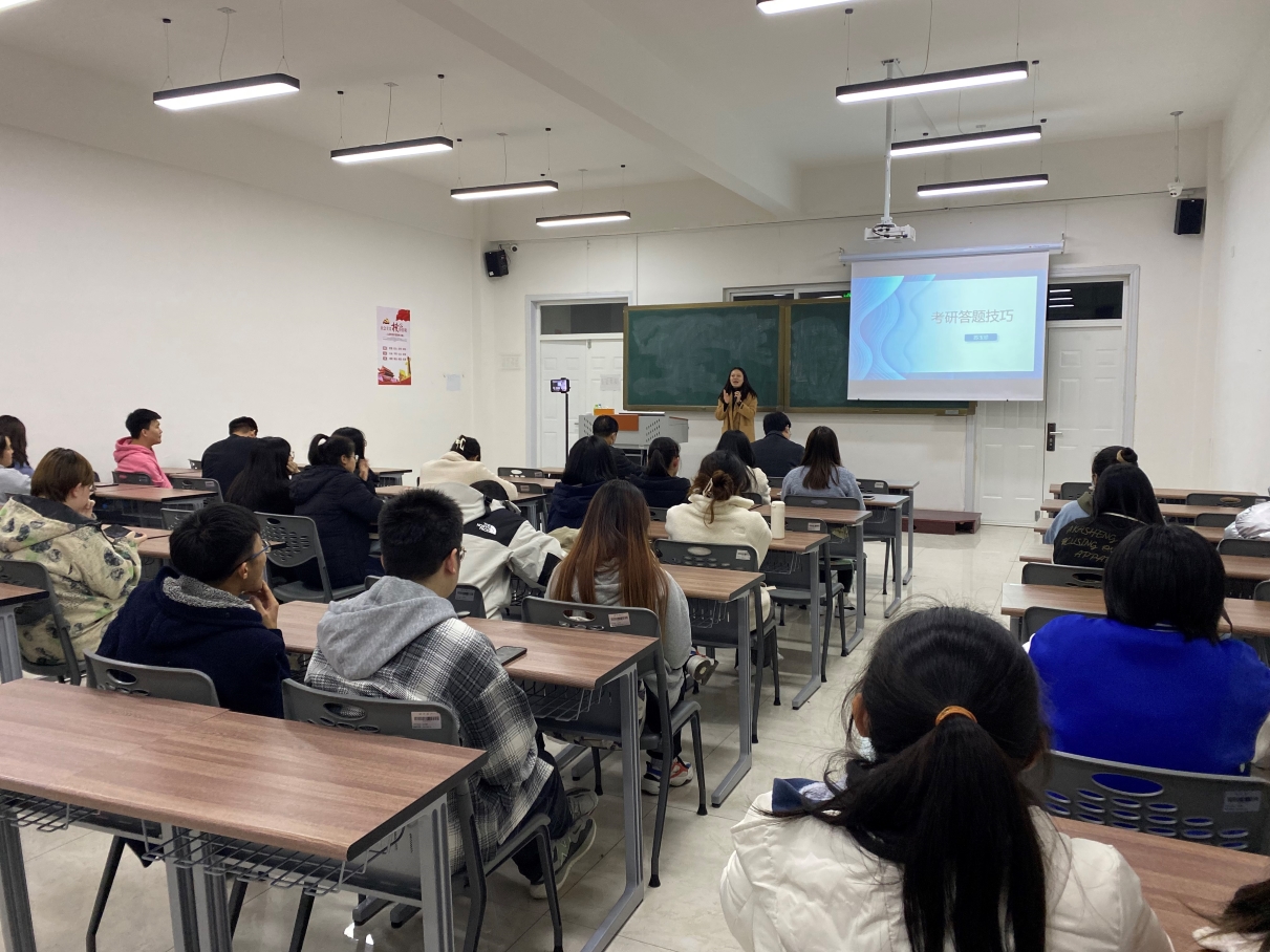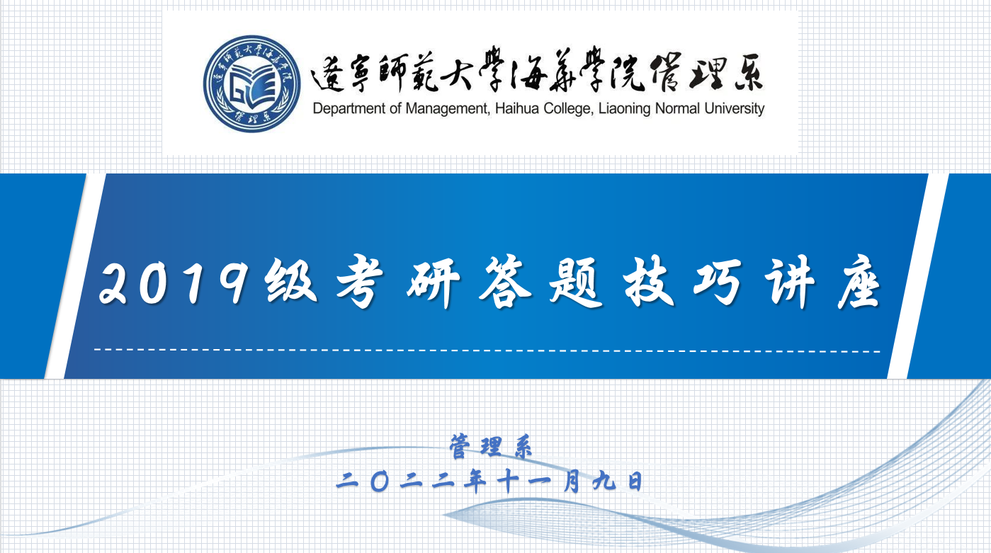 为提高学生考研复习效率,帮助同学们巩固考研专业课程基础,增强考研信心,2022年11月9日,管理系采取线上线下相结合方式在日新楼2-103室组织召开2019级考研学生答题技巧专题讲座,管理系主任栾美晨教授、副主任朱爱辉副教授、教研室负责人、考研指导教师及全体考研学生参加讲座,讲座由2019级辅导员梁瑜主持。