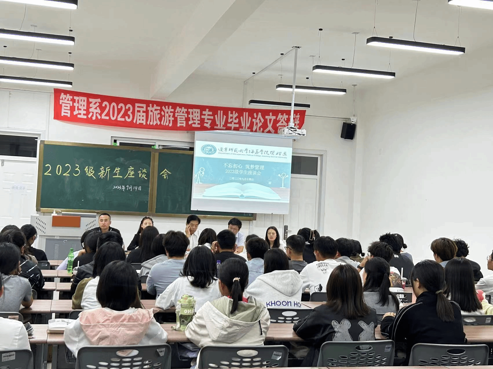 为进一步了解管理系2023级新生入学以来的学习生活情况,更好推进教风、学风建设,促进管理系教育教学、管理与服务等工作的提高。2023年9月14日18时,管理系在日新楼2-102室,组织召开2023级新生教育教学与管理座谈会。管理系主任栾美晨教授、教学副主任朱爱辉副教授、教研室负责人、辅导员参加并与2023级全体新生亲切座谈交流。本次座谈会由新生辅导员主持。