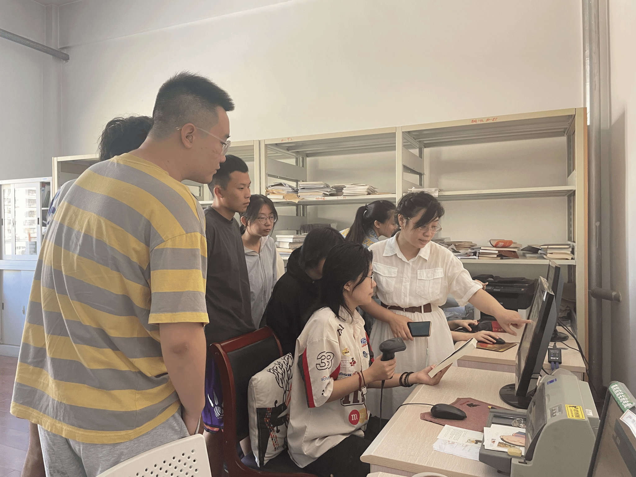次日,根据认识实习方案安排,学生正式进入分组实践环节,4-6人为一小组,馆员亲自为图书馆学专业学生讲解新书盖章、贴条码的操作规范、注意事项,并要求学生分组进行上机操作,了解编目规则,培养信息检索能力,将课程中的理论知识进行实践,便于学生快速进入学习状态。同时根据学生在校期间的《中国图书馆分类法》为学生安排排架工作。排架是未来每个从事图书馆工作的人员必备的技能之一,培养学生分类思维,更具条理性,掌握分类知识,即可迅速、有效地查询图书馆的馆藏动态信息,即可养成“书海找书不迷路”的技能。