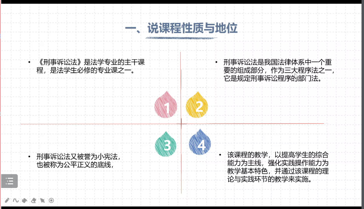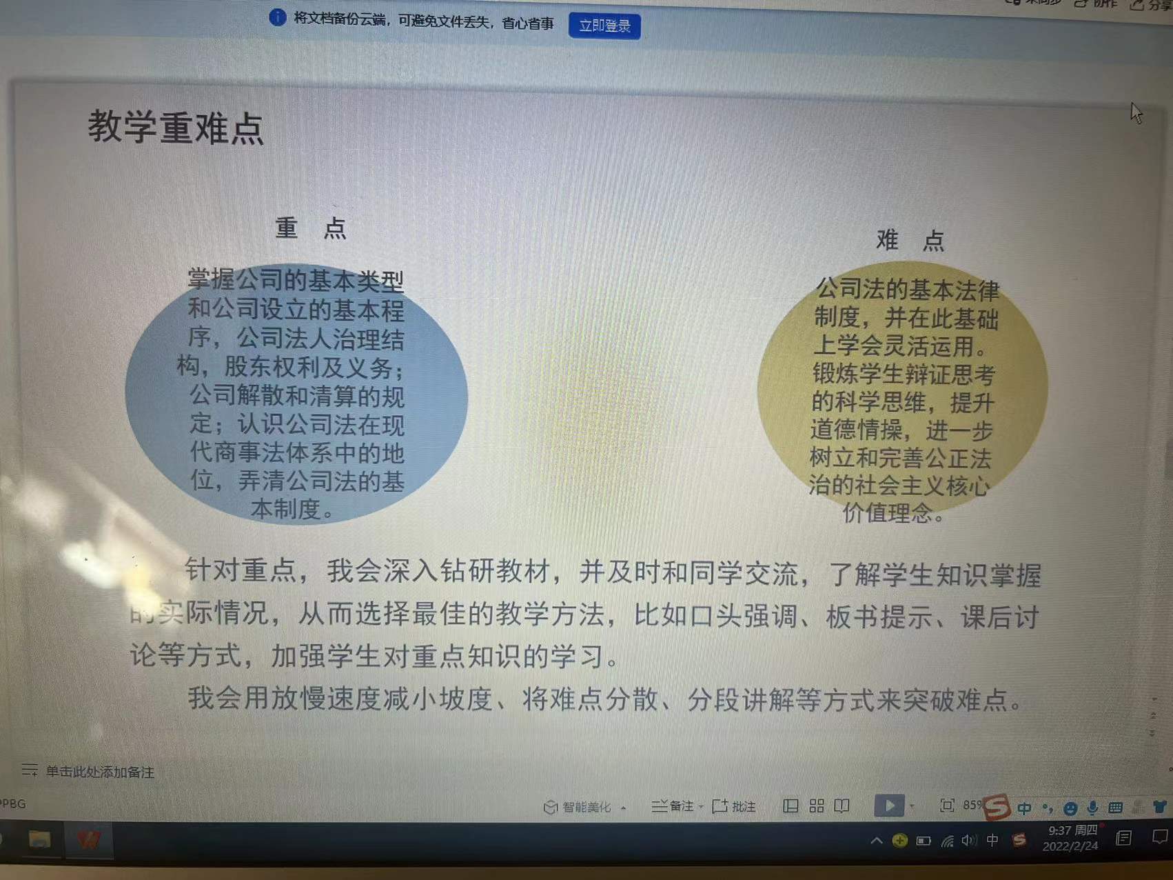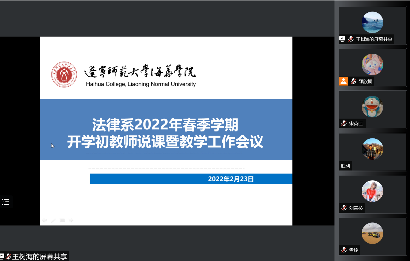 为进一步推进法学专业课程改革,引导教师深入专研研究教学、探讨教学方法,不断提高教师的教学基本功,2022年2月23日下午,法律系采用线上方式开展了2022年春季学期初教师说课活动。本次说课对象为新入职教师及本学期承担新课的教师,刘宣杉、潘望、马瑞莹、李梦、丁姝宏、孙旗共6位教师先后进行了说课。说课活动由法律系主任助理、法学教研室负责人孙羽主持,法律系全体专任教师观摩了此次活动。