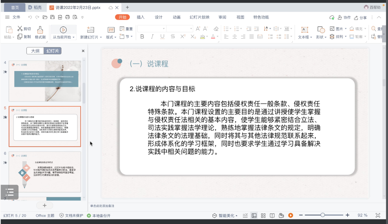 参加说课的老师分别围绕课程、教材、教学方法、授课计划与安排等方面进行了说课。老师们高度重视此次说课活动,准备充分,课件制作精美,思路清晰,语言表达流畅,体现出了各位老师对教材的把控能力、对课程的了解程度、较强的教学设计能力以及语言表达能力。