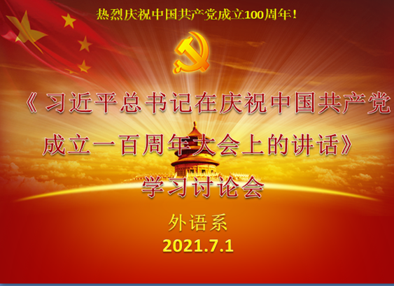 首先由外语系党支部许书记讨论发言,许书记为教师们和同学们梳理了习近平总书记重要讲话的内容。从鸦片战争的聚集革命力量到新民主主义推翻三座大山,再到中国人民迎来了从站起来,富起来,到强起来翻天覆地的变化,使教师们和同学们清楚地认识到中国从开天辟地,改天换地,翻天覆地,到惊天动地的一次一次的伟大飞跃和胜利!经过全党全国各族人民持续奋斗,我们实现了第一个百年奋斗目标,在中华大地上全面建成了小康社会,历史性地解决了绝对贫困问题,正在意气风发向着全面建成社会主义现代化强国的第二个百年奋斗目标迈进!经过许书记对习近平总书记重要讲话的梳理,外语系教师们和同学们深刻理解中国共产党带领中国人民,经过百年奋战,人民生活发生翻天覆地的变化过程。全场教师与同学振奋激昂,深感中国共产党的伟大!深感身为中国人的幸福!全场共同高呼:“致敬!伟大的中国共产党!伟大、光荣、正确的中国共产党万岁!”