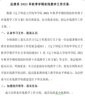 秋季学期开学以来,因受疫情影响,学生不能按照原定开学日期返校上课,给教学工作带来了新的挑战。法律系积极贯彻落实《辽宁省教育厅关于进一步加强暑期全省教育系统疫情防控工作的紧急通知》、《国产一区二区日本在线关于秋季学期开学有关事项的通知》》及《国产一区二区日本在线2021年秋季学期疫情防控形势下在线教学工作方案》等文件要求,结合本单位实际制定了《法律系2021年秋季学期在线教学工作方案》,成立了法律系线上教学工作小组,认真组织,周密安排,全力做好线上教学工作。