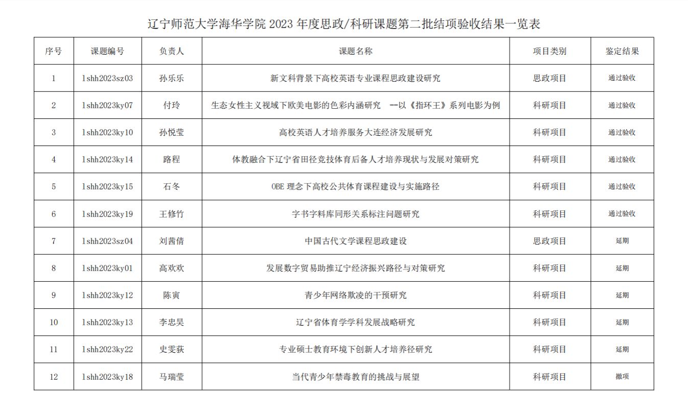 经科技处对学校2023年度思政/科研项目负责人所提交的结项材料进行审核、组织专家验收,最终确定6项课题符合结项标准,通过结题验收,5项延期,1项撤项。5项延期项目在规定时间内,发表成果后经审验符合结项标准的,补办结项证书。具体名单如下: